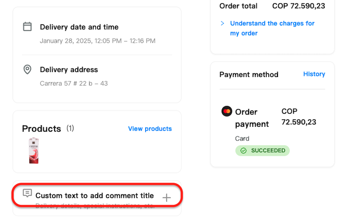 | customTexts.addCommentTitle | addCommentTitleText | Parameter to customize the title Add a comment to your order in add comments component |